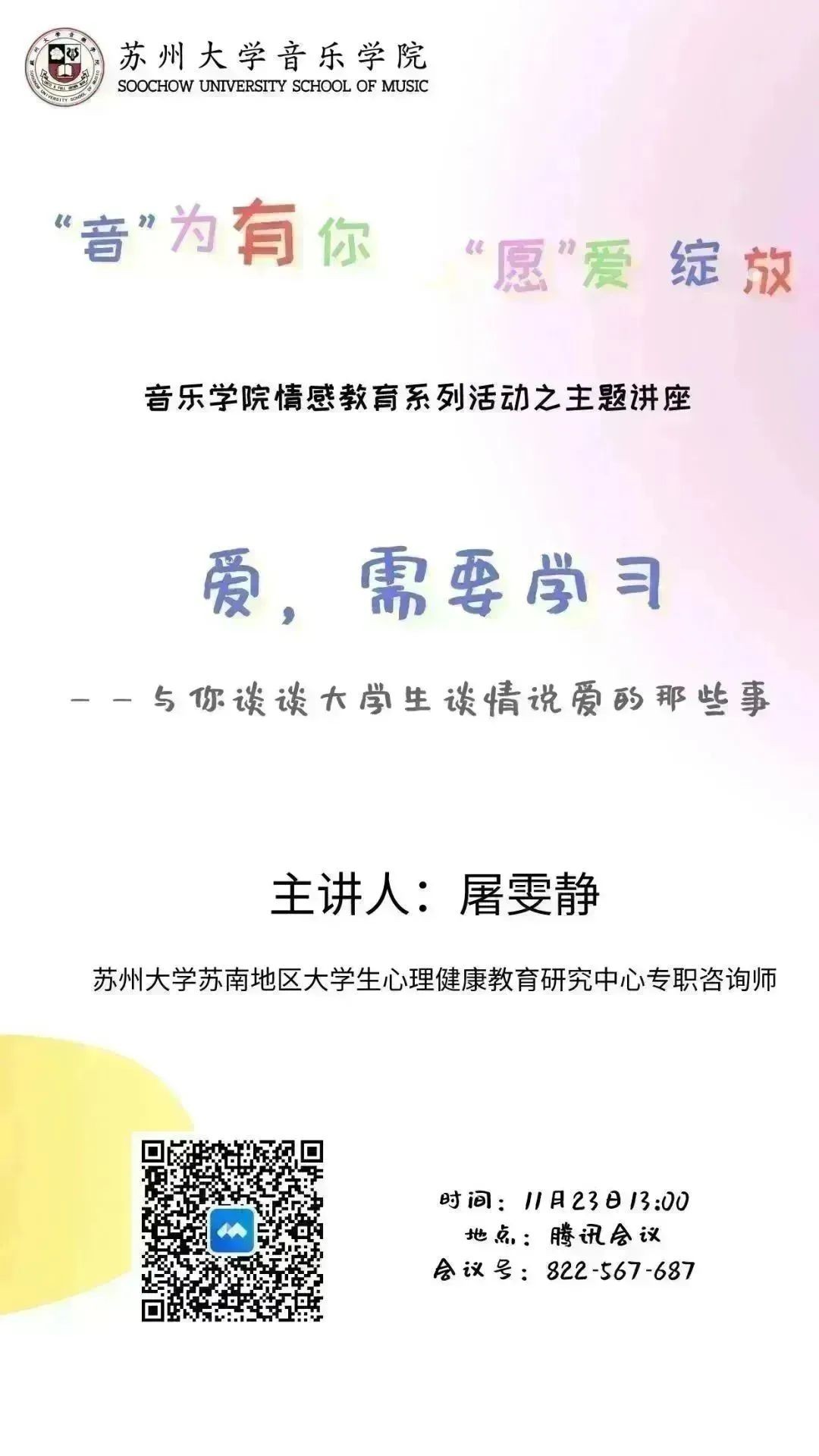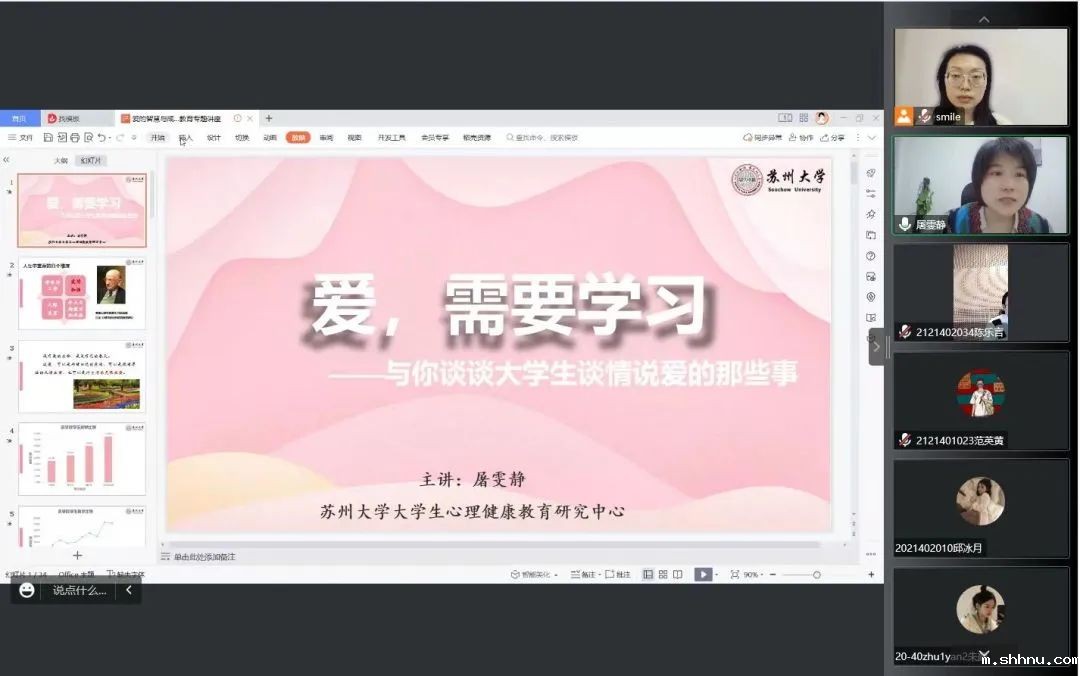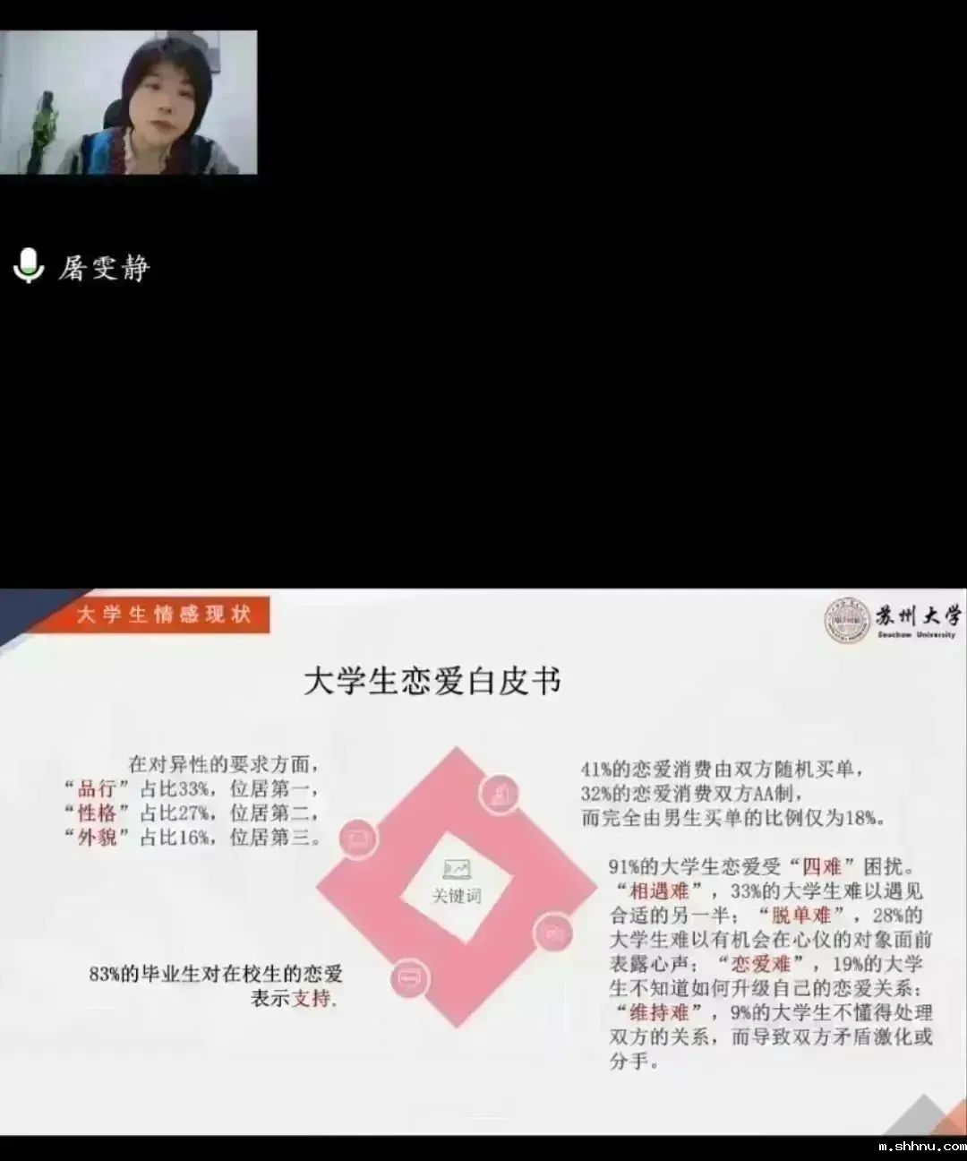 11月23日下午,bw必威西汉姆联官网首页在线上举办情感教育主题讲座:爱,需要学习——与你谈谈大学生谈情说爱的那些事。本次讲座邀请到了苏州大学大学生心理健康教育研究中心专职教师屠雯静老师主讲。