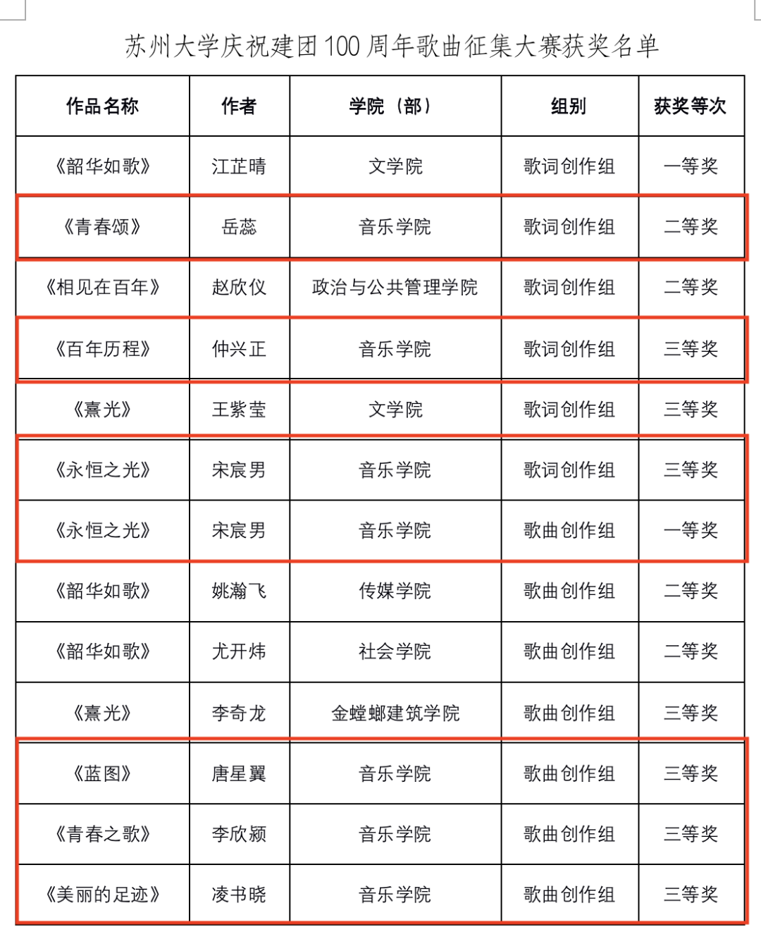 为深入学习贯彻习近平新时代中国特色社会主义思想,团结和凝聚青年力量,生动展现苏大青年百年来紧跟党走、接续奋斗的光荣历程和新时代不负韶华、开拓创新的精神风貌,bw必威西汉姆联官网首页积极组织学生参加学校举办的庆祝建团100周年歌曲征集大赛,向大赛组委会提交12首原创作品。经评委老师严格筛选,最终产生13部获奖作品,其中7部为我院学生作品。宋宸男创作的歌曲《永恒之光》作为苏州大学庆祝中国共青团成立100周年主题曲在苏州大学官微上发布。