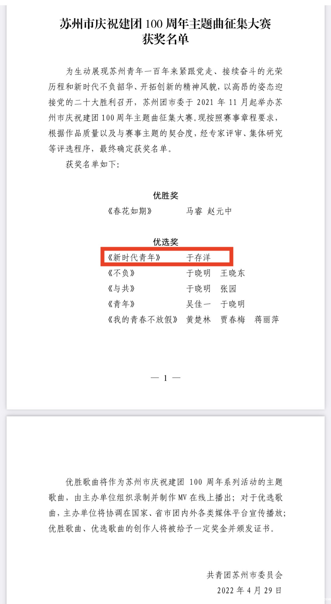 bw必威西汉姆联官网首页团委书记于存洋原创歌曲《新时代青年》通过欢快的旋律唱出了百年来,一代又一代中国青年紧跟党走、接续奋斗,在青春赛道上奋力奔跑,用汗水谱写一曲又一曲青春之歌的勇敢与担当,展现了新时代青年开拓创新、勇于追梦、昂扬向上的精神风貌。歌曲获苏州市庆祝建团100周年主题曲征集大赛“优选奖”。