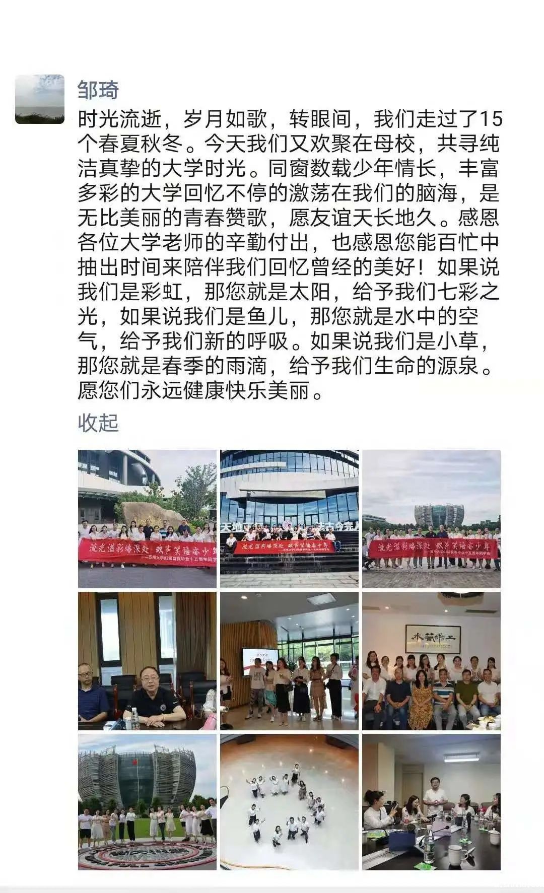相聚时难,别亦难。回望当年,同学们怀揣着对音乐的热爱、对教育事业的追求来到苏大。在校四年接受了老师们的谆谆教诲、精心培养,毕业时同学们满怀职业理想踏入各自的工作岗位、扬帆远航。十五年后,同学们铭记着苏大校训、师长的期望、音乐专业的责任在各自岗位上发光发热。最后同学们饱含深情唱起了东吴校歌,表示将以更优异的成绩回报母校!师恩情深,同学谊厚,离苏后的校友纷纷秀起了朋友圈,寄以无限深情与祝福!