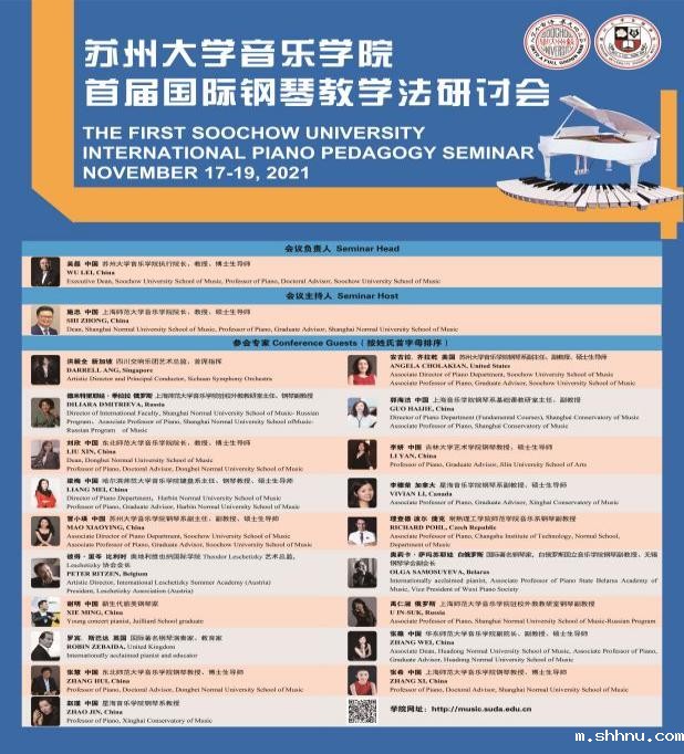 由苏州大学主办、必威BetWay在线官网承办的首届“苏州大学国际钢琴教学法研讨会”于2021年11月17日至2021年11月19日在苏州举行。研讨会邀请来自欧洲、北美及中国的世界级高水平古典音乐艺术家、教育家及青年教师,通过“线上+线下”的方式展开云端对话,聚焦钢琴教育的前沿动态与最新发展,从教育心理学、音乐脑科学、运动生理学和新科技等方面入手展开学术交流与课题。本次研讨会获得苏州大学国际合作交流处的大力支持,为期三天,由圆桌论坛和大师课讲座两部分组成。