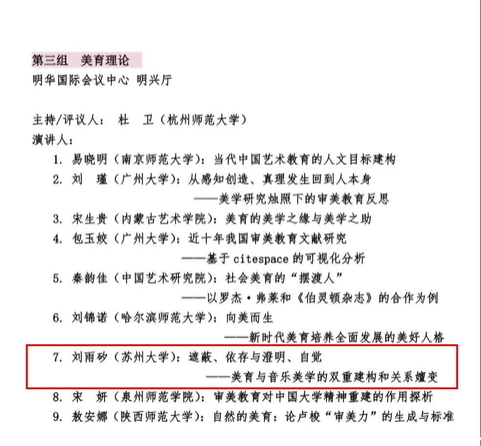 在“美育理论”分组会议上,刘雨矽博士从学科视角出发,认为美育与音乐美学是与美学相关的两个不同学科。美育承载美学形而下之实践层面,音乐美学则关乎美学形而上之理论与经验方面。纵观中西音乐美学思想发展历程,美育与音乐美学之思想内涵与价值意义在历史沿革中彼此互为牵引,依次呈现出“遮蔽依存”、“忽明忽暗”、“主体缺位”、“澄明自觉”等生存样态。发言结束后,杭州师范大学教授、中华美学学会副会长杜卫对刘雨矽博士的论文予以肯定和赞赏,并指出“美育离不开艺术教育,尤其是音乐教育。美育学是多学科交叉而成的应用型学科。因此,美育理论研究更应从跨学科视角出发,于不同学科的相容关系中寻求构建中华美育话语体系。”