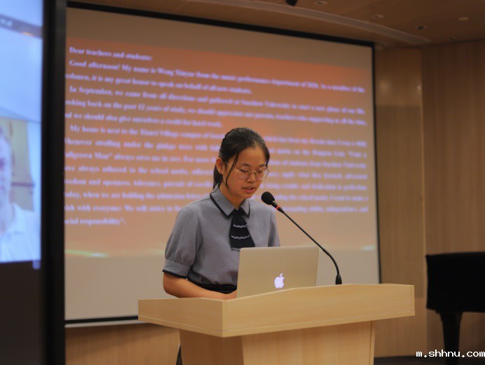 2020级音乐表演专业新生代表翁心悦同学提到苏州大学是她梦想中的大学,并结合音乐专业的特点,回顾过去展望未来。她表示,进入大学就像“乐章新起,一切归零”,将未来的学习之路分为三个境界“明”“行”“得”,要明确目标,努力为梦想而拼搏。