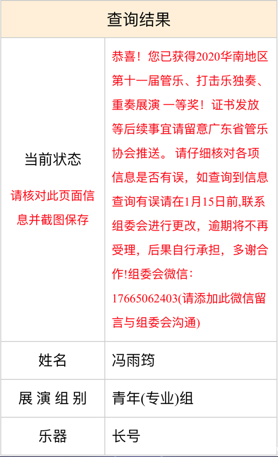 2020年12月29日,华南地区第十一届管乐、打击乐独奏、重奏展演在广东完美落幕。该项赛事由广东省音乐家协会、广东省管乐协会于2005年创建的,至今已有15年的历史。是华南地区最具专业性,影响力最大的管乐打击乐艺术比赛。