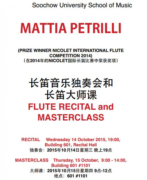 Guest ArtistMattia Petrilli, Italian flutist, Prize Winner of the International NicoletFlute Competition, is visiting the Soochow University School of Music. He willgive a recital for flute alone on Wednesday October 14 at the Recital Hall,building 601, at 7p.m. Mr. Petrilli will also give a Masterclass to the studentsof the flute studio on Thursday October 15 from 9a.m. to 2p.m.