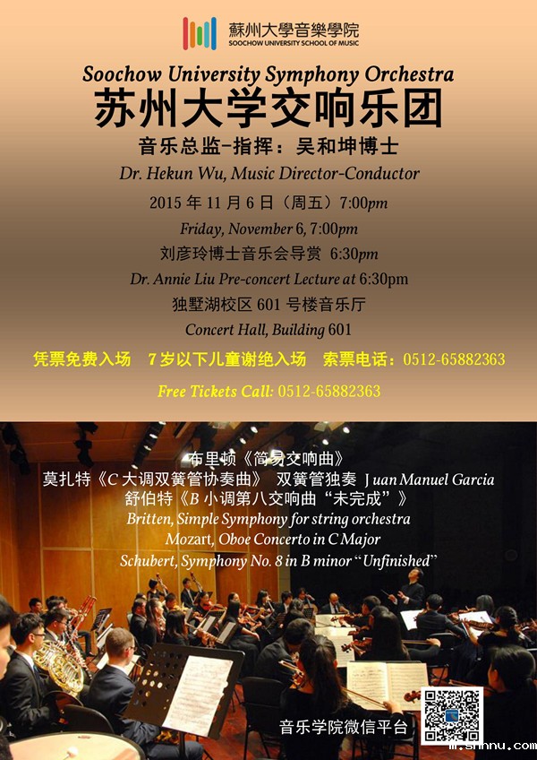 必威BetWay在线官网交响乐团将呈现2015-16 学年第一场音乐会,吴和坤院长担任指挥。乐团将演奏英国作曲家布里顿的《简易交响曲》、莫扎特《双簧管协奏曲》,bw必威西汉姆联官网首页来自西班牙双簧管演奏家旺玛教授担任独奏,乐团也将荣幸地同听众分享舒伯特不朽的《未完成交响曲》。这首交响曲连同贝多芬的《第五交响曲》是整个交响乐文献中最为频繁演奏和录音的两首交响曲。