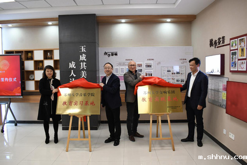 院长吴磊、副院长魏正启,相城区教育副局长缪芙蓉,相城高新区(元和街道)党工委委员王志强共同为“必威BetWay在线官网教育实习基地”和“苏州大学交响乐团教育实践基地”揭牌。