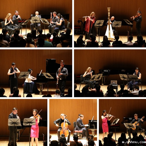 整场音乐会上,演奏家们依次演奏了莫扎特的《双簧管和小提琴歌剧二重奏》、舒曼的《幻想曲,作品73号》、德彪西的《长笛、中提琴和竖琴奏鸣曲》、麦可鲁尔的《同源》、格林卡的《悲怆钢琴、单簧管和巴松三重奏》、帕格尼尼的《吉他与小提琴A大调协奏奏鸣曲》和亨德密特的《小室内乐,作品24之二》,共七首曲目。