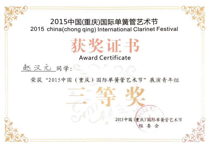 8月13-17日,由中国单簧管协会举办的2015年中国国际单簧管音乐节在重庆举办,来自美国费城交响乐团的单簧管首席Ricardo Morales,法国布菲单簧管艺术家Nicolas Baldeyron, 巴黎国家歌剧院管弦乐团单簧管首席Philippe Cuper等和国内艺术院校的单簧管教授们齐聚山城,为参加的学生和当地的民众带来了一场听觉与视觉的盛宴。在音乐节的第二天,我院单簧管表演专业大二学生——赵汉元在此次音乐节的青年组单簧管比赛中荣获三等奖。
