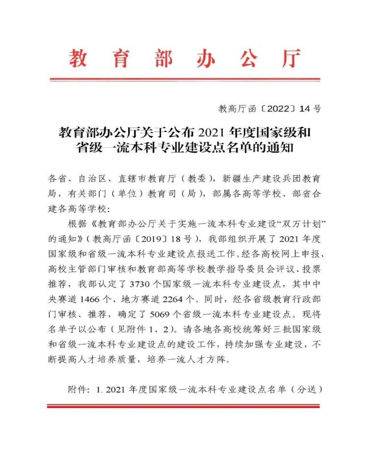 2021年,学校积极对接教育部“双万计划”中的一流专业建设,在前两年申报工作的基础上,学校积极总结经验,组织召开多场专题申报会、推进会和评审会,持续完善申报材料,择优推荐18个专业申报2021年度国家级一流本科专业建设点。最终包括音乐学在内的14个专业成功入选2021年度国家级一流本科专业建设点,入选数位列全省第三,省属高校第一。