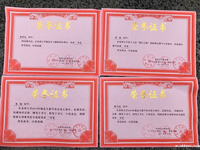 此次我院共有4名同学参赛,黄惠同学在明日之师模拟课堂教学大赛中,荣获课堂教学比赛一等奖;陈昱廷同学和朱悦同学在师范生教学基本功大赛中,基础知识竞赛、钢笔字书写、粉笔字书写、口语表达、模拟授课五项赛事中综合成绩分别荣获二等奖、三等奖;董爱钰同学在师范生主题演讲比赛中荣获二等奖。
